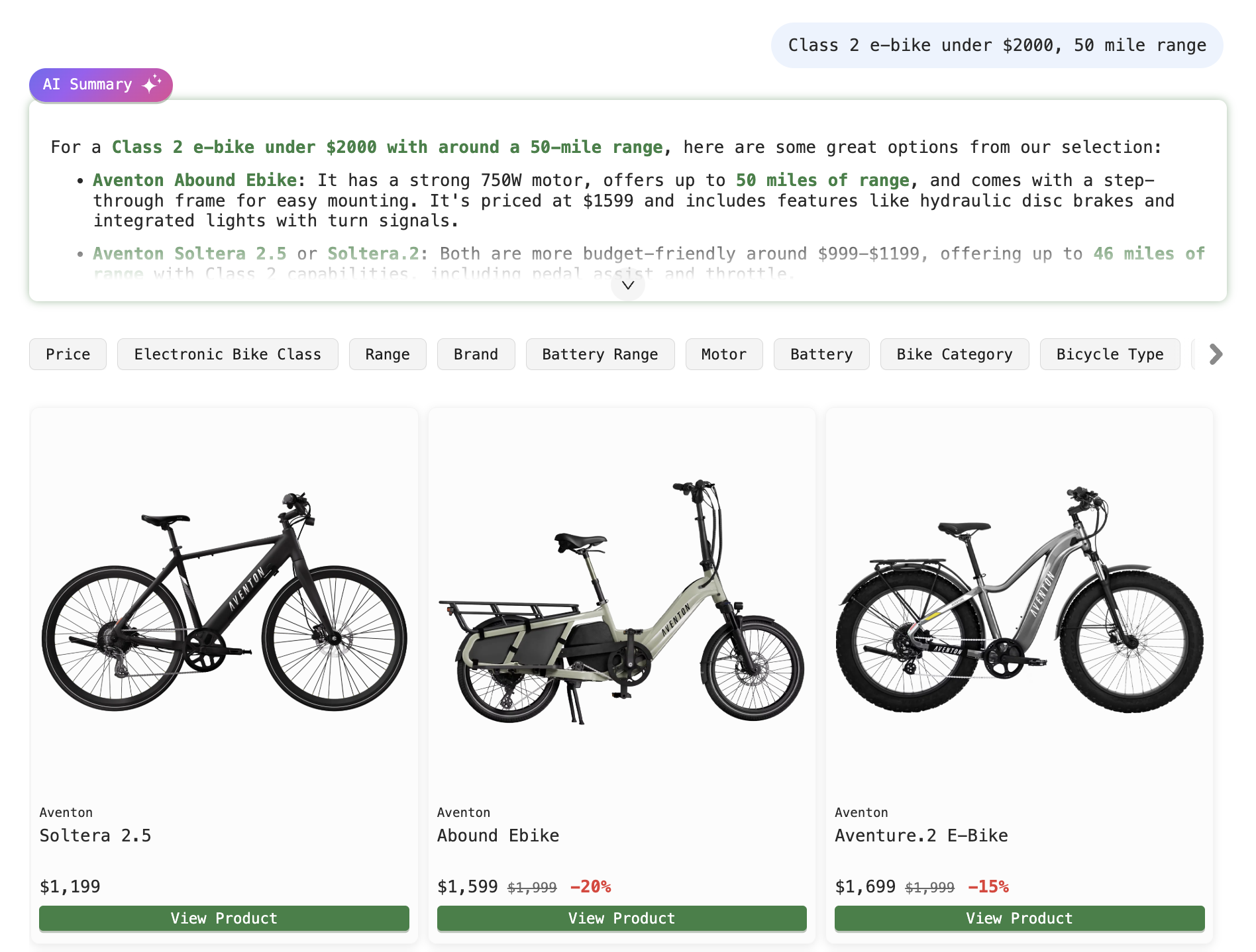 - “Class 2 e-bike under $2000, 50+ mile range”